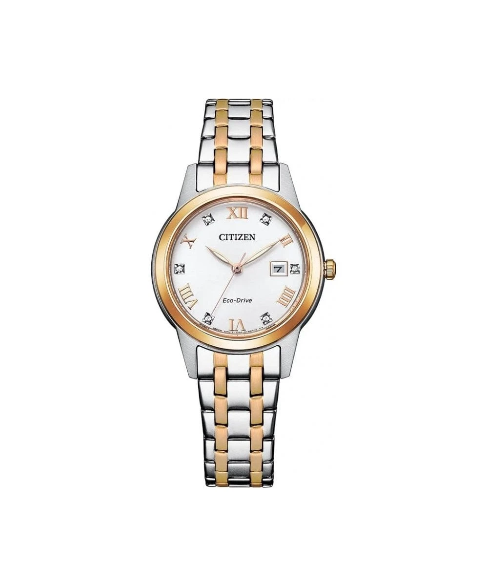 Modern appeal and sleek design, make this Silhouette Crystal the perfect finishing touch to your watch wardrobe. Two tone stainless steel and rose gold plating bracelet paired with a white dial hand set with 6 beautiful crystals. Featuring Eco-Drive technology, powered by light, any light, never needs a battery.