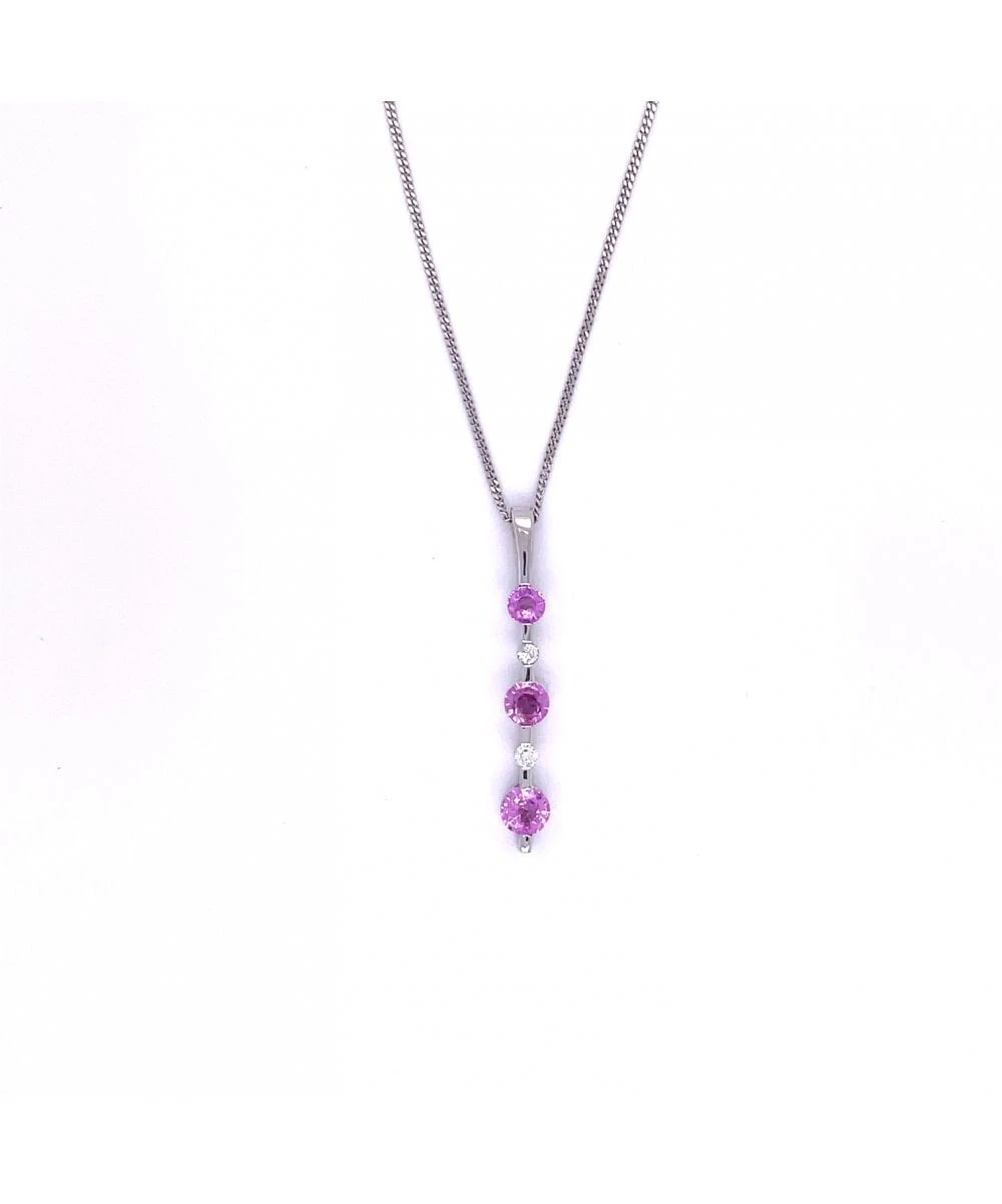 14ct white gold pendant set with three sparkling pink sapphires and two smaller diamonds in a bar style pendant. Supplied on a 9ct white gold curb chain.