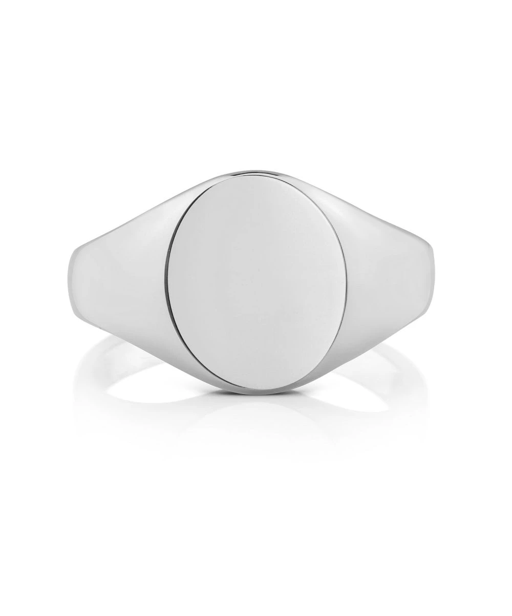 A sterling silver oval shaped signet ring featuring a 12mm x 10mm head. Made in a heavy weight gauge. Available in a range of finger sizes.