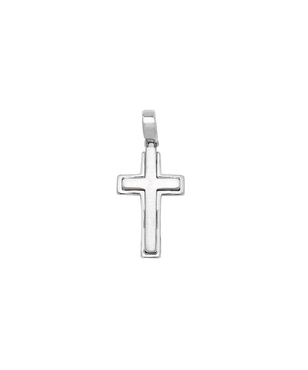 Double layered medium sized cross made in Sterling Silver with a satin finish cross and polished outer layer and finished with rhodium plating. This cross measures approximately 22mm x 13mm. Comes without a chain, or add a chain of your choice with the options in the basket.