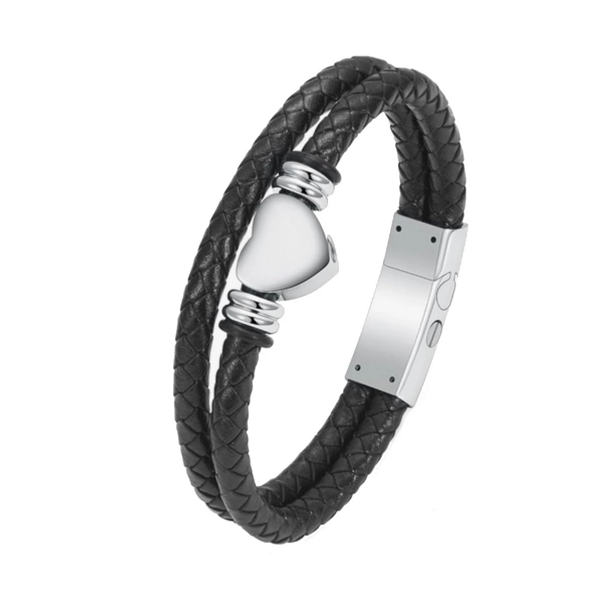 Introducing our unisex Heart Leather Bracelet, a cremation memorial keepsake designed with a discreet chamber within the heart to securely hold a small amount of your loved one’s ashes. Crafted from premium 316L stainless steel and leather, this bracelet blends beauty with durability. It’s a stunning and affordable piece of ashes jewellery, serving as a heartfelt tribute. Personalised engraving options are available to add a unique touch.