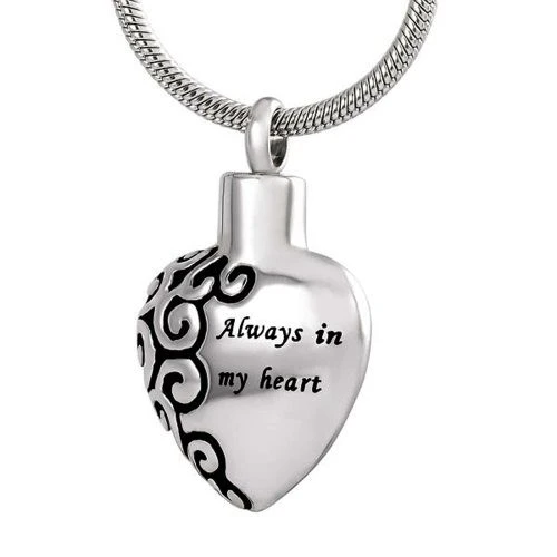 This classic Scroll ‘Always in my Heart’ cremation ashes pendant has a chamber inside which you can use to house the ashes of your loved one. The pendant is made from high quality 316L hypoallergenic Stainless Steel which makes the perfect practical choice for durability. Beautiful and affordable piece of cremation ashes memorial jewellery.