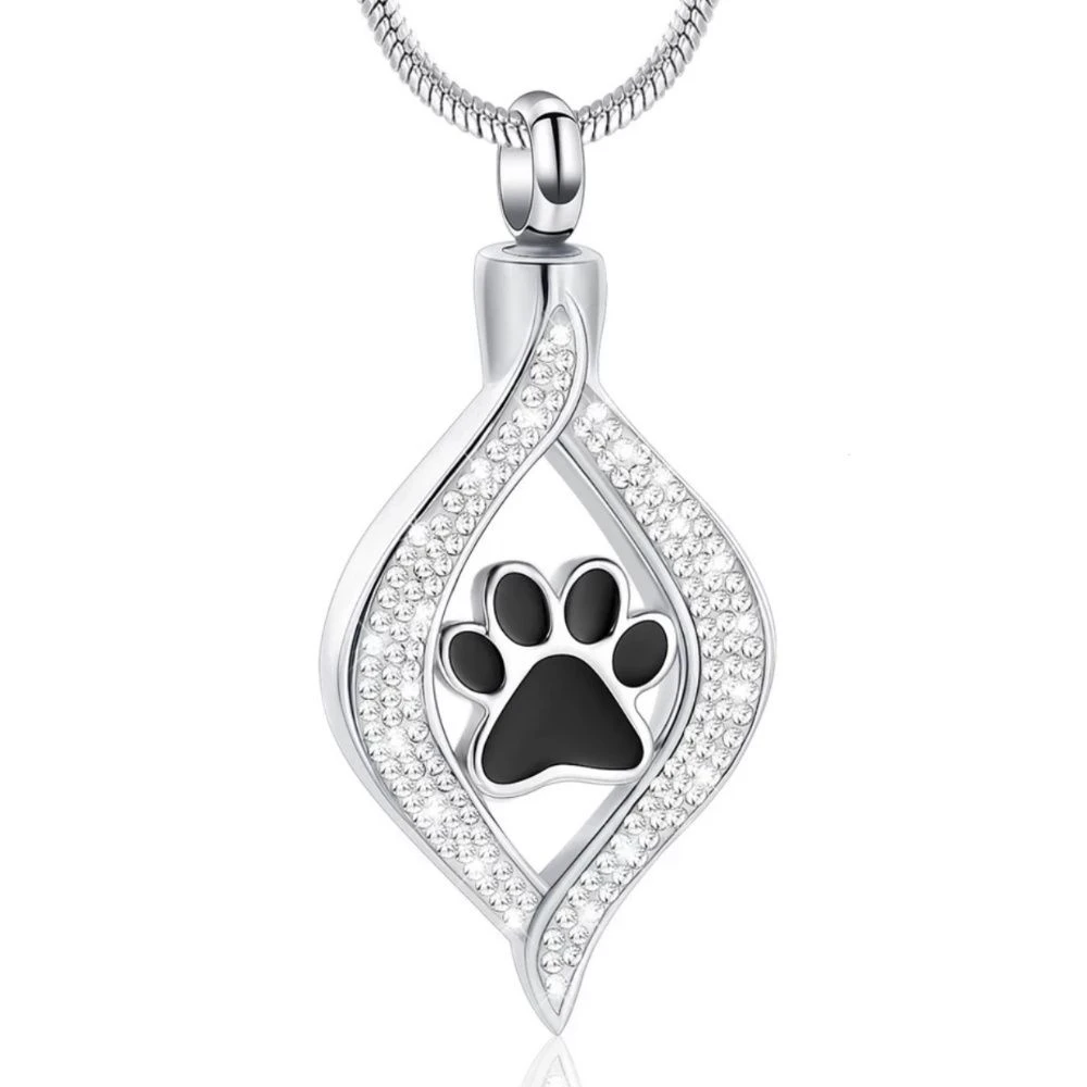The Teardrop Ribbon Paw Cremation Ashes Memorial Keepsake Pendant has a chamber inside which you can use to house the ashes of your beloved pet. The pendant is made from high quality stainless steel. Beautiful and affordable piece of jewellery.
