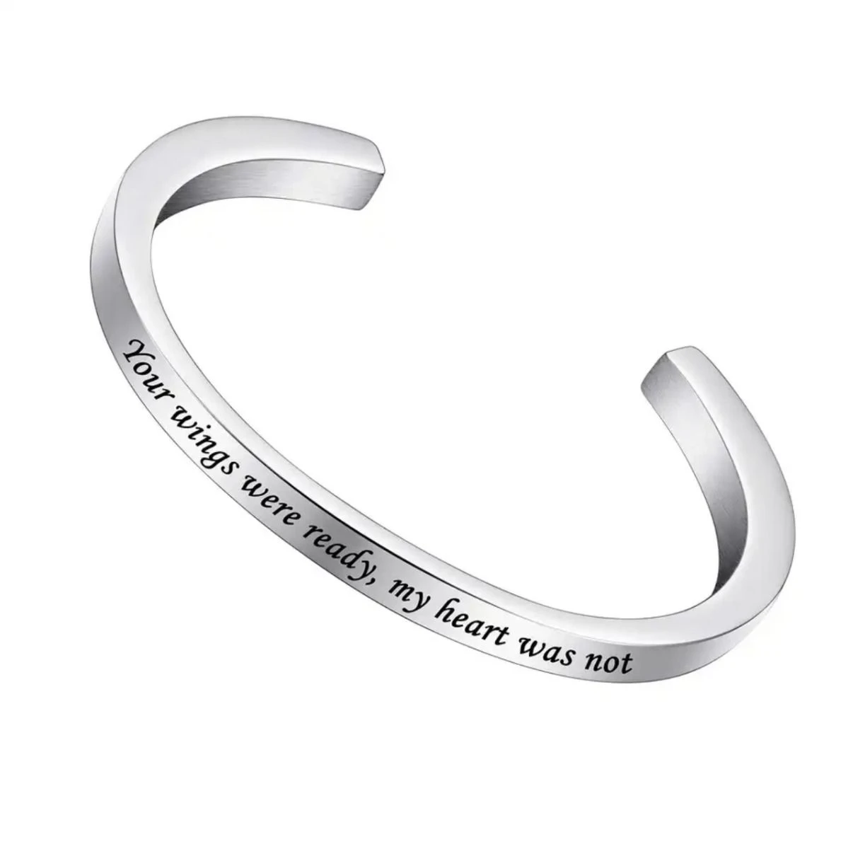 Introducing our elegant unisex cuff bangle, pre-engraved with the touching message “Your wings were ready, but my heart was not.” Designed discreetly to hold a small token of your loved one’s ashes, crafted from high-quality stainless steel. Delivered in beautiful branded packaging, it’s a heartfelt keepsake or thoughtful gift.
